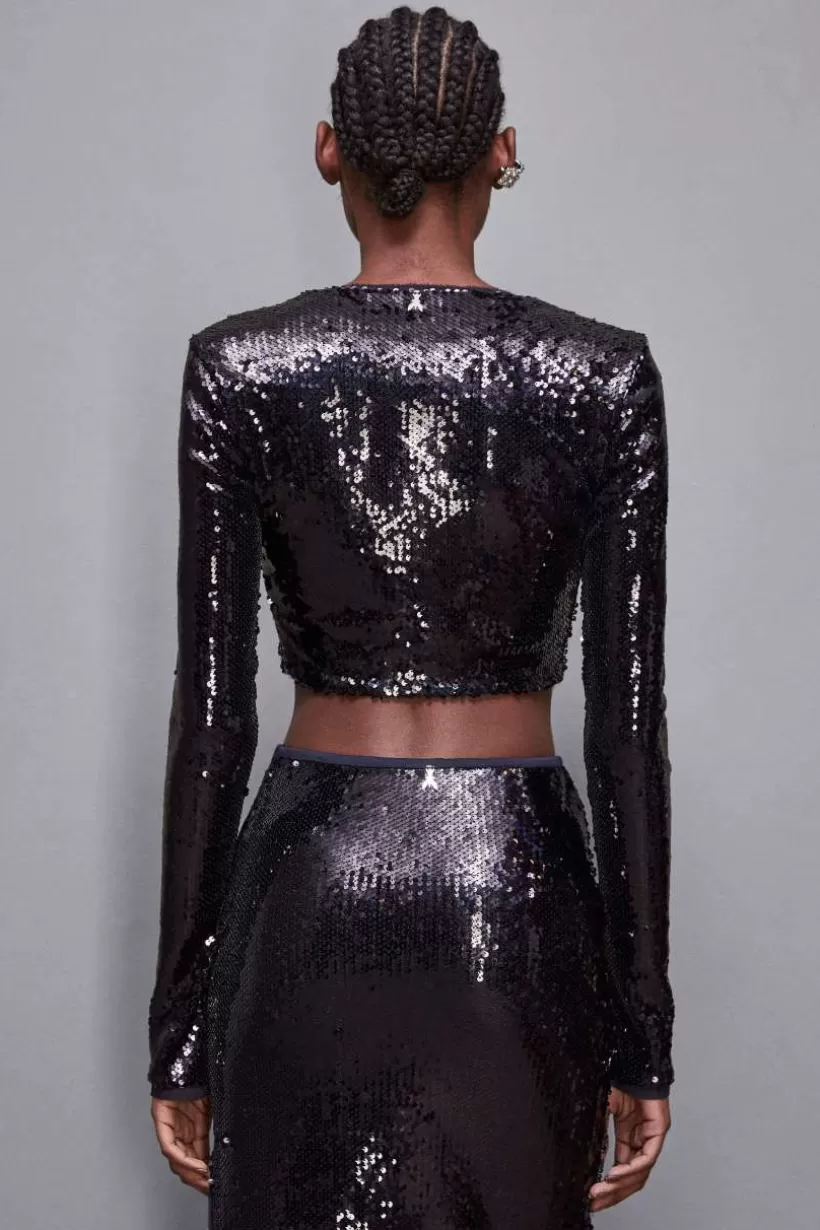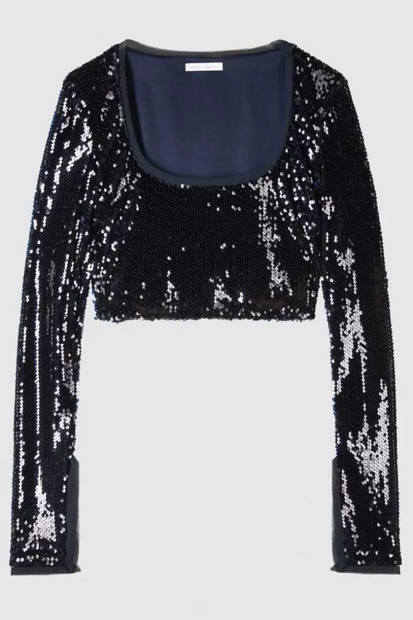 Mnóstwo cekinów, które rozjaśnią wyjątkowe okazje. Elegancka bluzka w stylu hiper glam o rozkloszowanych rękawach u dołu i kroju regular. Długość cropped nadaje stylizacji ultranowoczesnego charakteru.