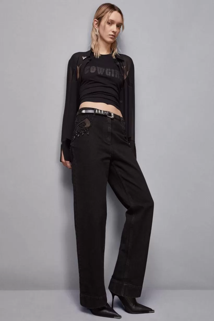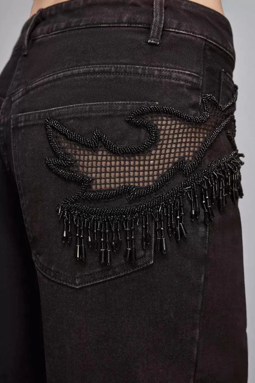 Jeansy z biżuteryjną wstawką oraz haftem na biodrach z cekinami i koralikami staną się Twoim nowym wyrazistym elementem stylizacji. Połącz je z parą czółenek, aby stworzyć stylizację o rockowym charakterze.