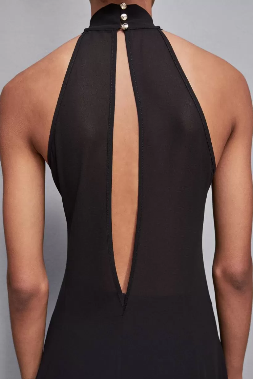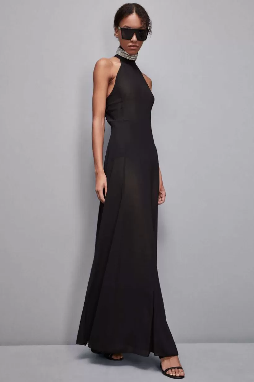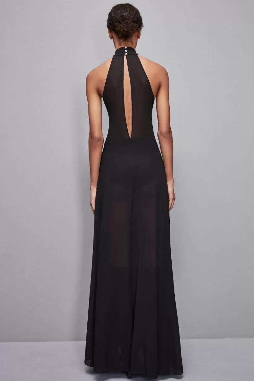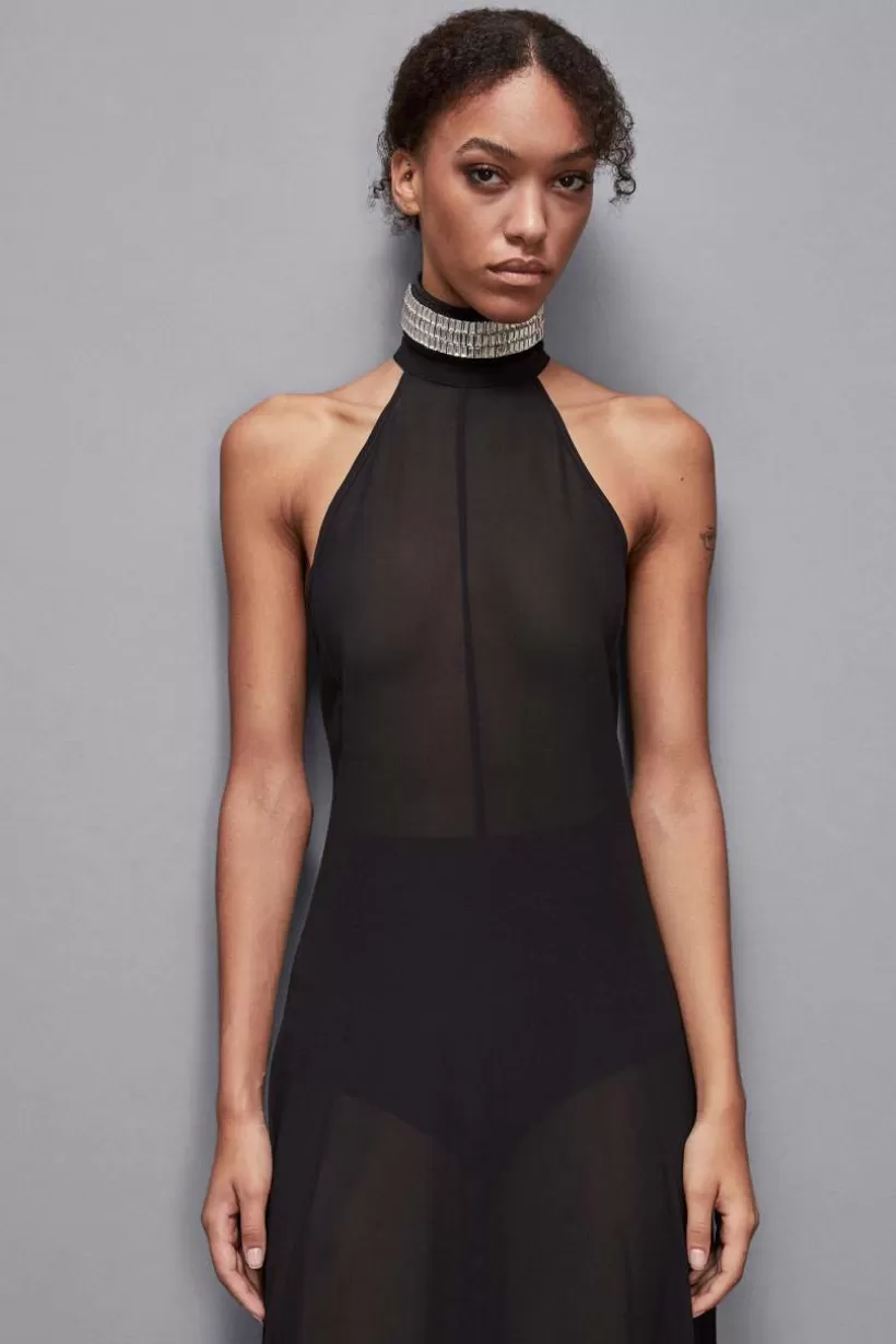 Ta zwiewna, przezroczysta sukienka dopasowuje się do ciała dzięki smukłemu krojowi i delikatnym detalom. Odważny dekolt typu halter oraz odkryte plecy dodają elegancji, a podszewka w formie szortów zapewnia subtelne okrycie, łącząc elegancję z zmysłowością. Kobieca, śmiała i urzekająca.