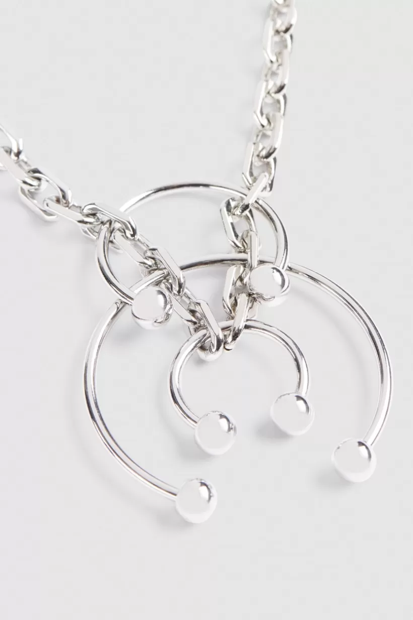 Długi naszyjnik wykonany z błyszczącego niklu, z zestawem zawieszek w stylu piercing, które sprawiają, że jest on …