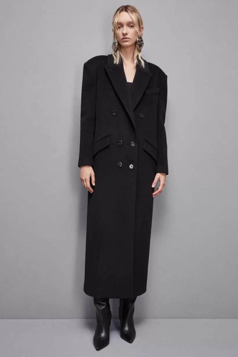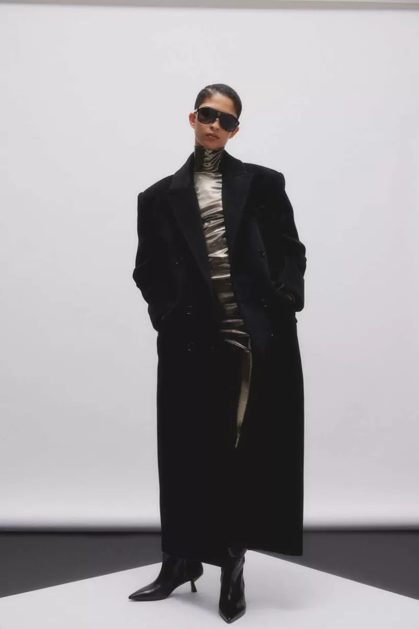 Dwurzędowy płaszcz z tkaniny podkreśli eleganckie stylizacje tego sezonu. Długość do kostek wyróżnia się wydatnymi ramionami, które nadają ubraniu hiper-szykowny urok.