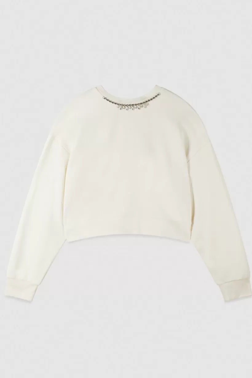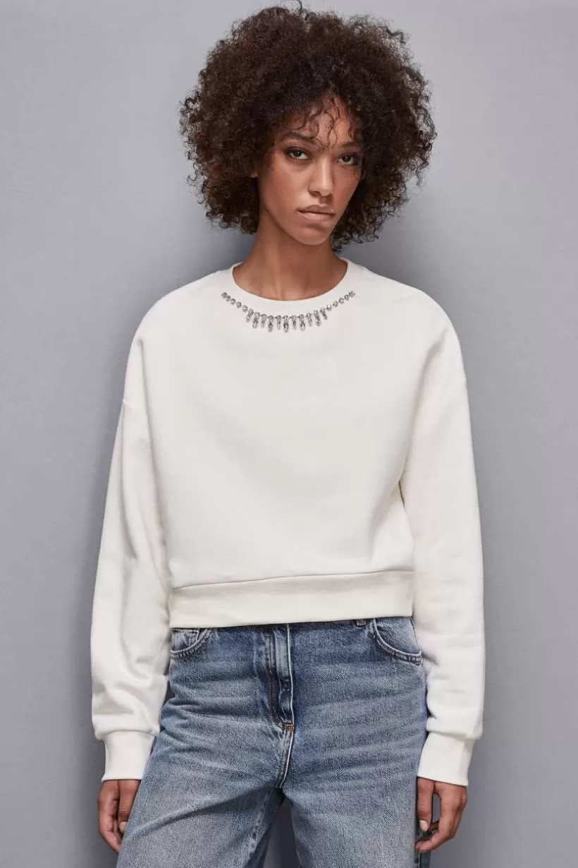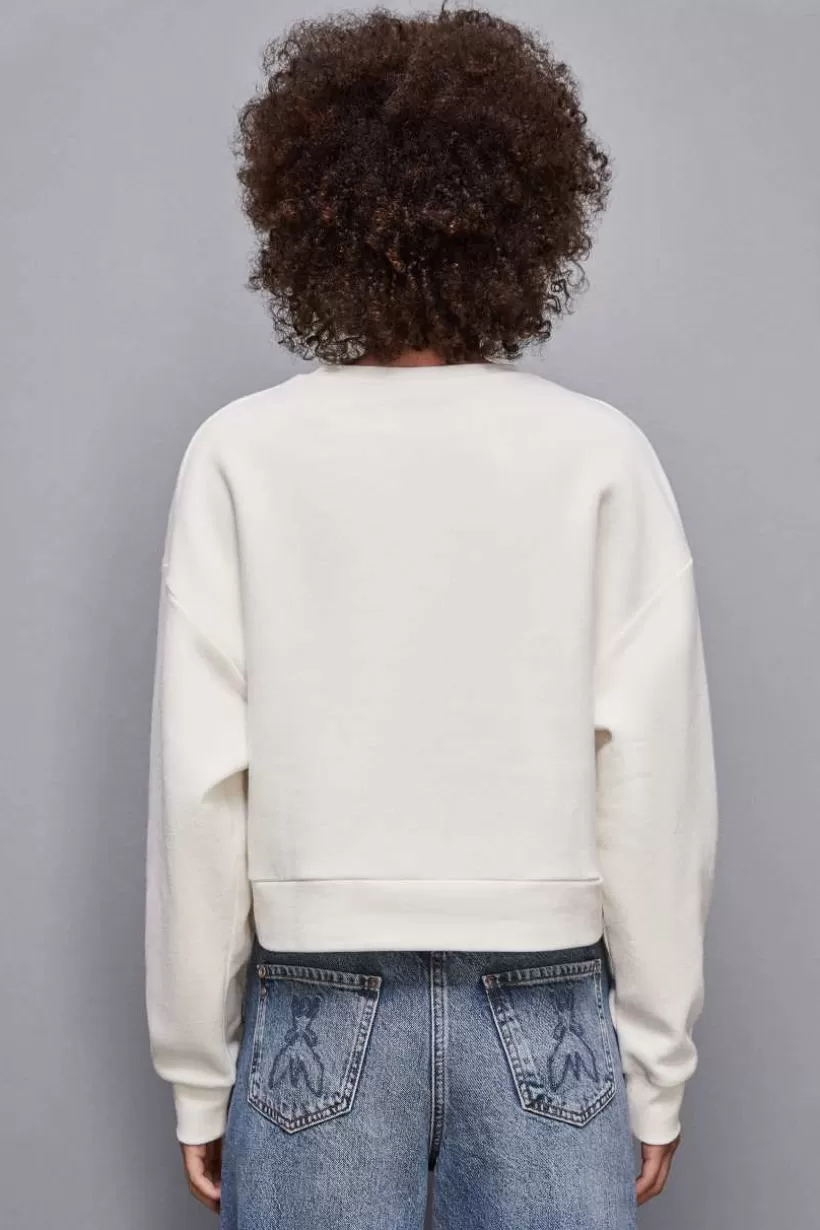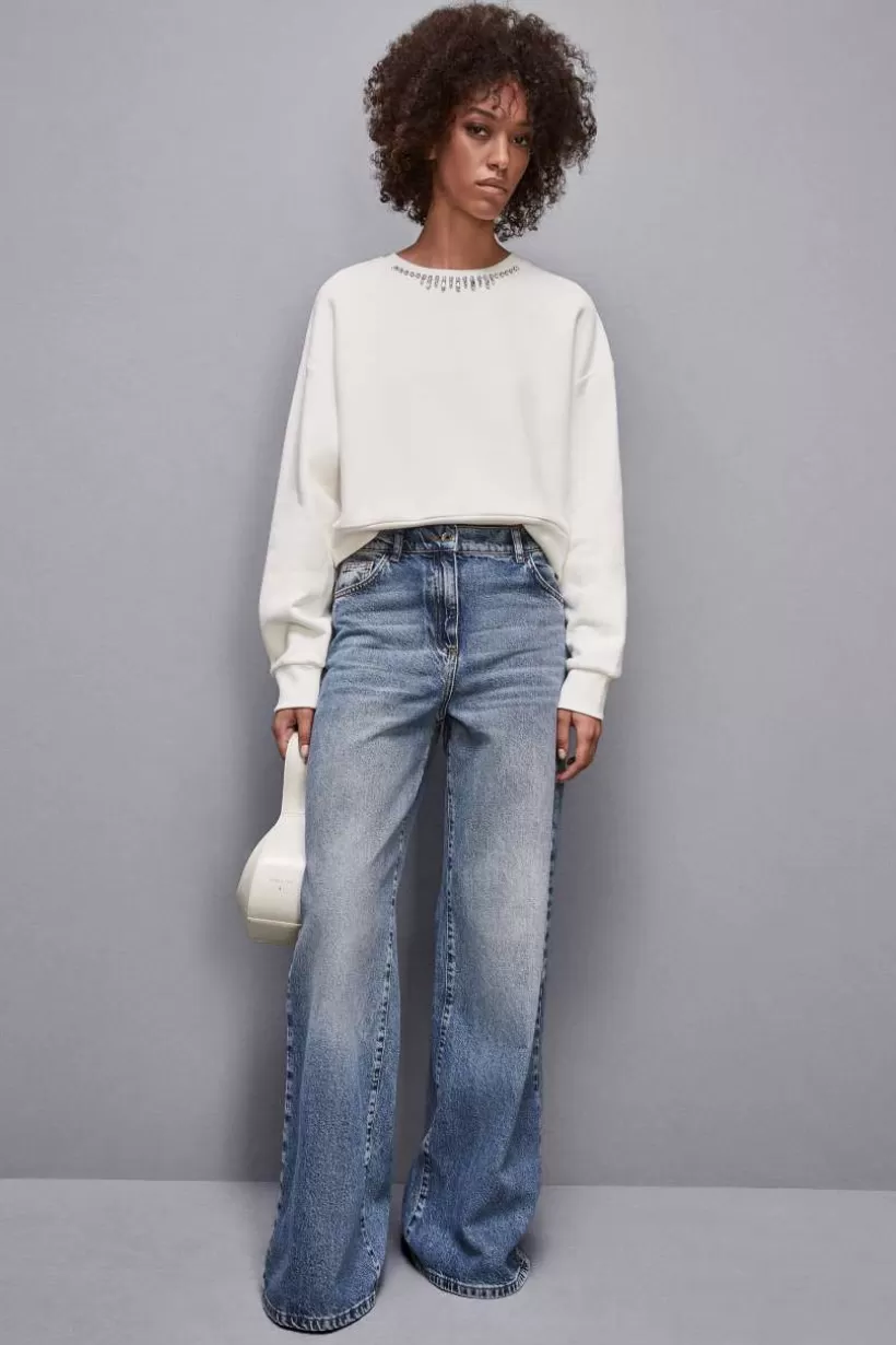 Patrizia Pepe na nowo interpretuje najbardziej klasyczne elementy casualowej garderoby z detalami w stylu hiperglamour. Luźna bluza została ozdobiona lśniącym biżuteryjnym motywem i haftowanym detalem Fly u dołu.