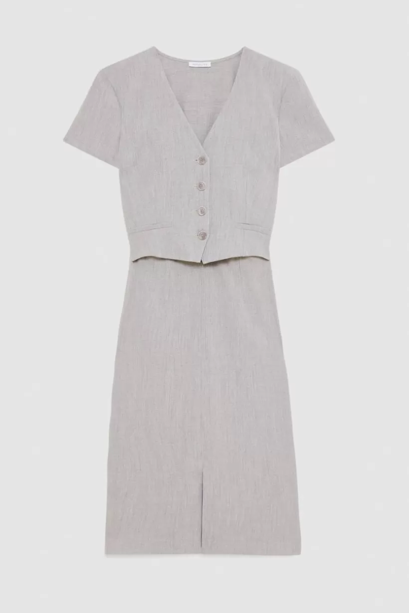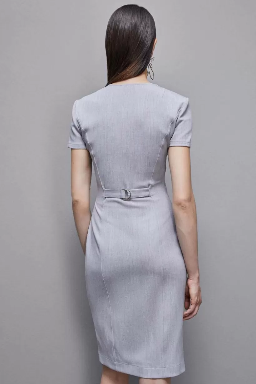 Dżersejowa sukienka mini bez rękawów w elegancki sposób podkreśli kobiecość sylwetki. Idealna na różne okazje, z dekoltem w serek i dopasowanymi guzikami z logo.