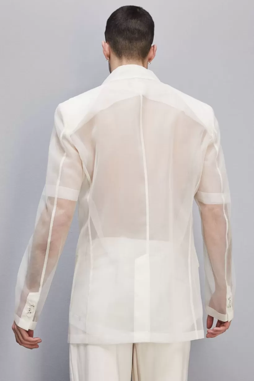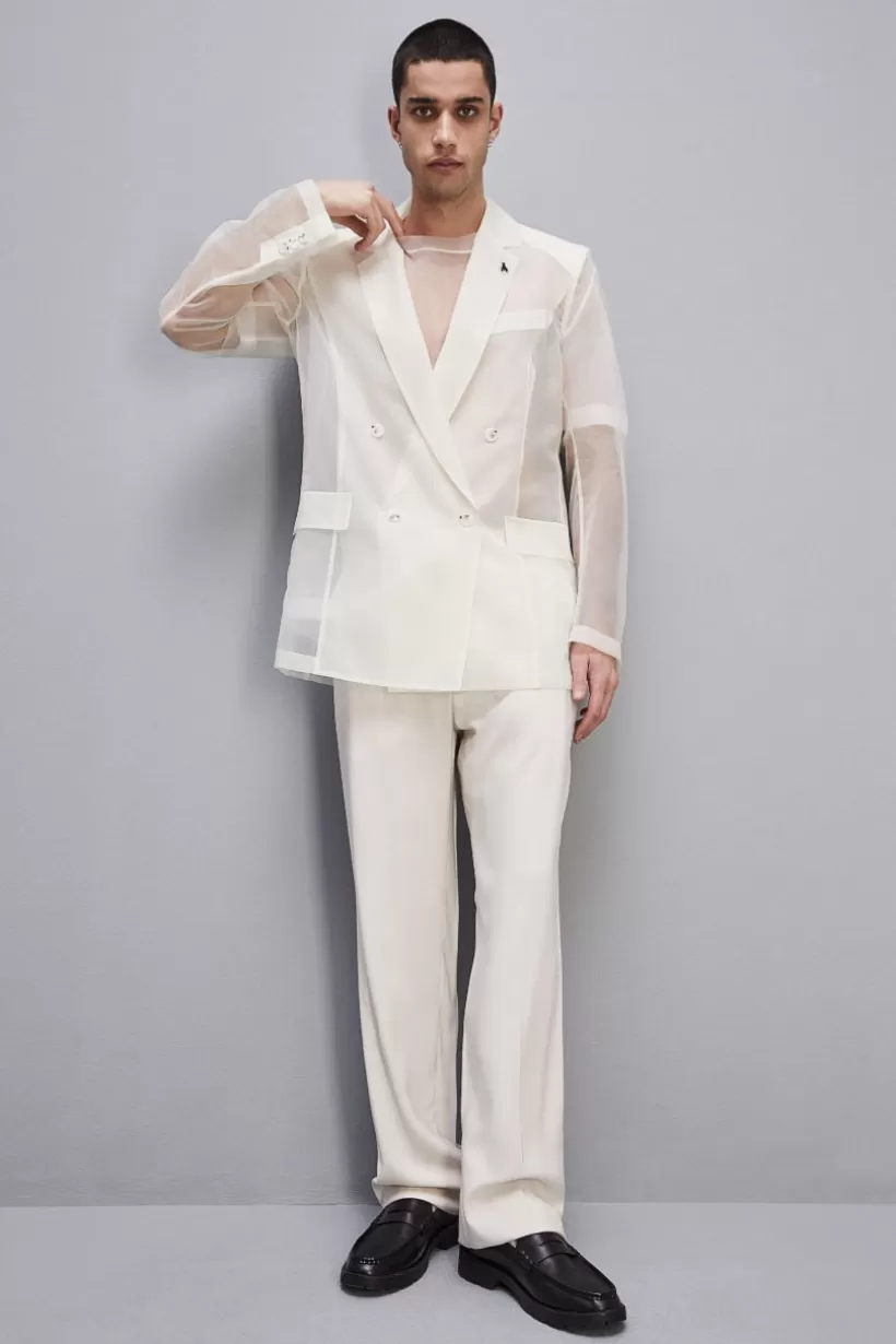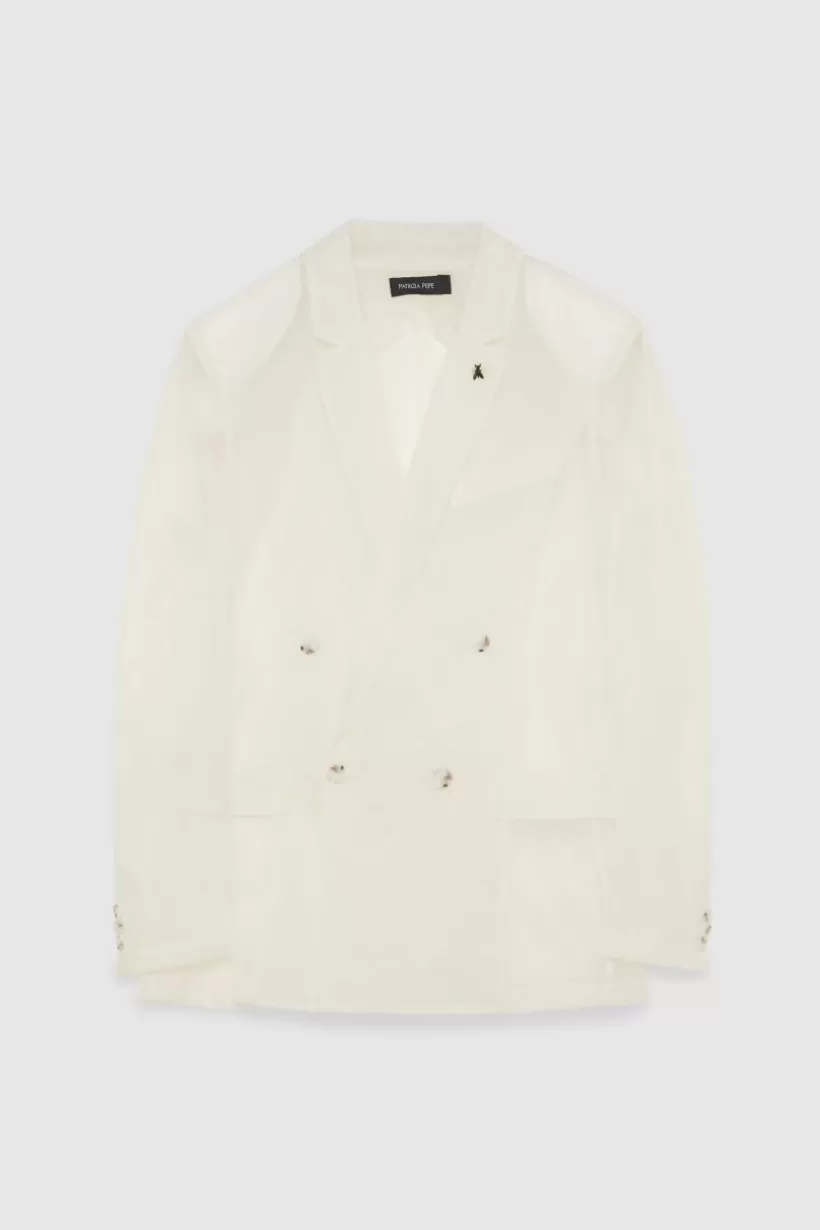 Elegancka i wyrafinowana dwurzędowa marynarka z organzy marki Patrizia Pepe wyróżnia się prostym krojem i guzikami z efektem masy perłowej z logo oraz przypinką Fly na klapie.