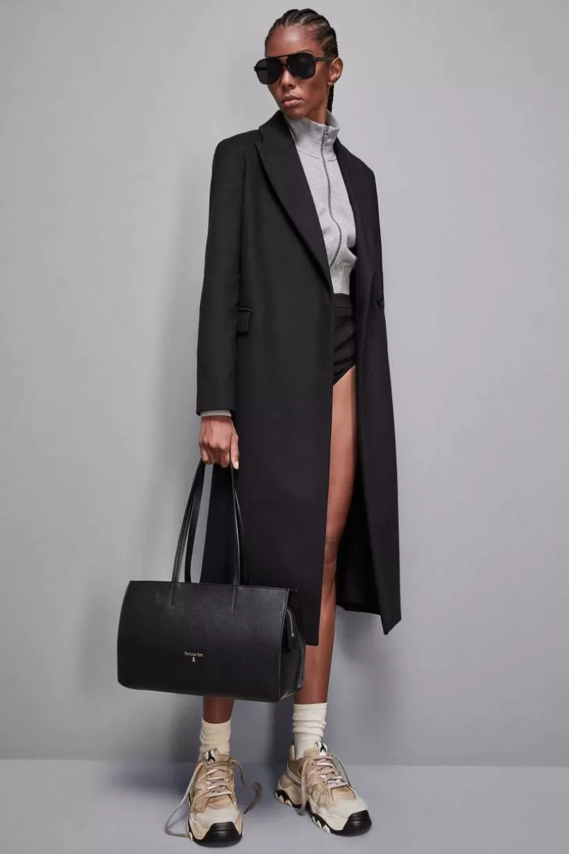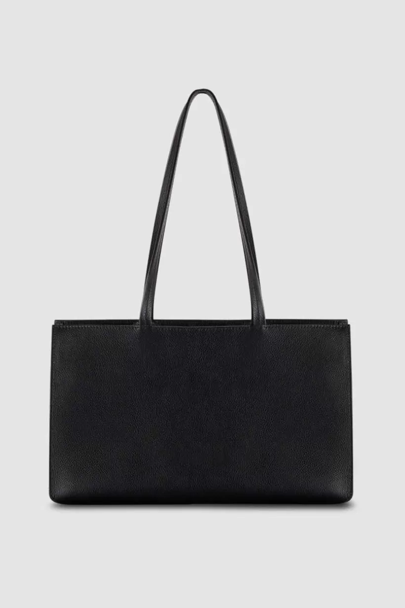 Torba na zakupy z ziarnistej skóry charakteryzuje się minimalistycznym i wyrafinowanym stylem odpowiednim do codziennych stylizacji. Posiada zapięcie na suwak i aplikację z pozłacanym napisem.