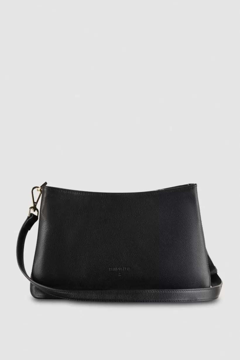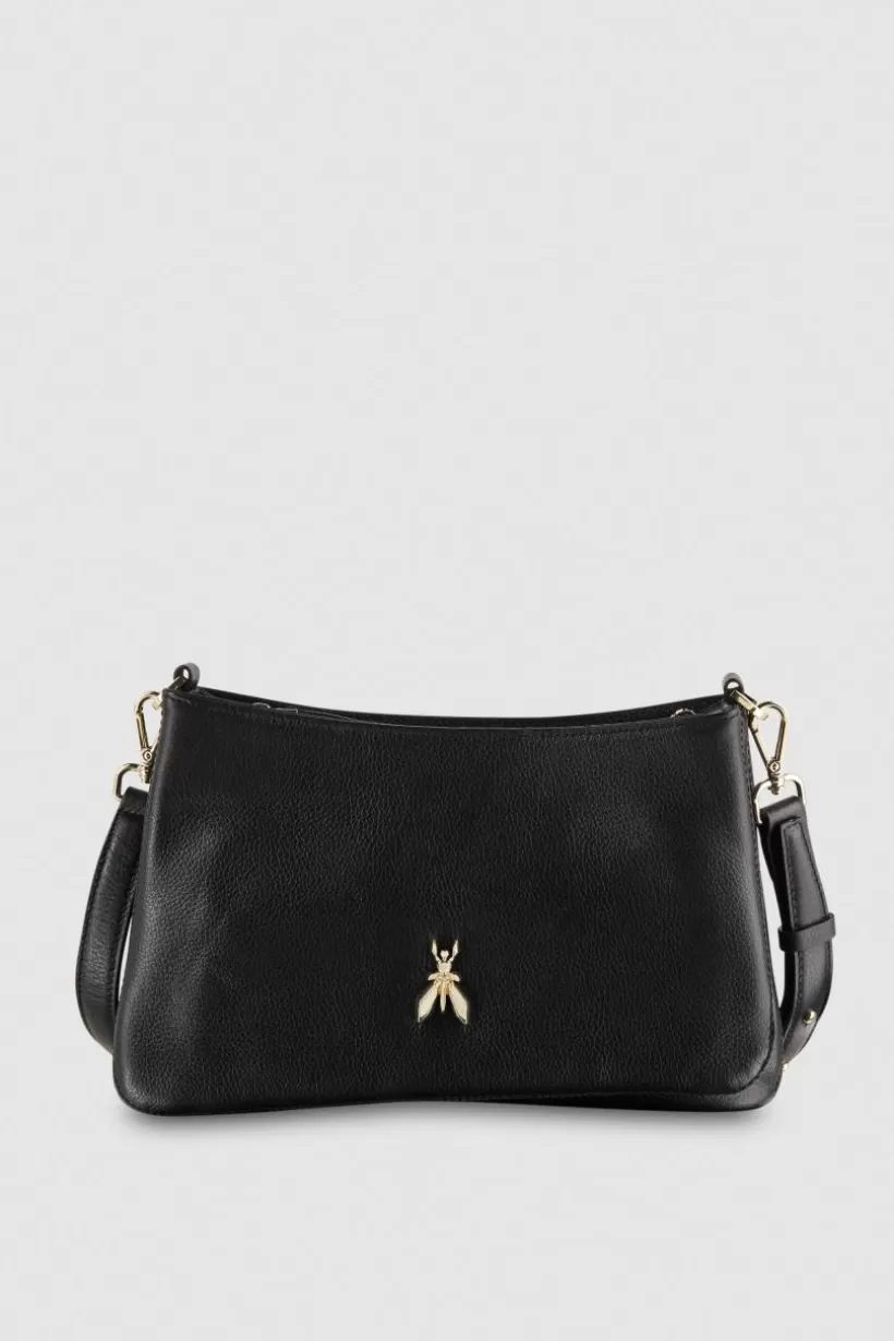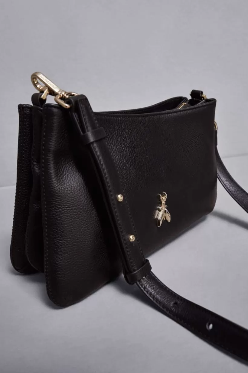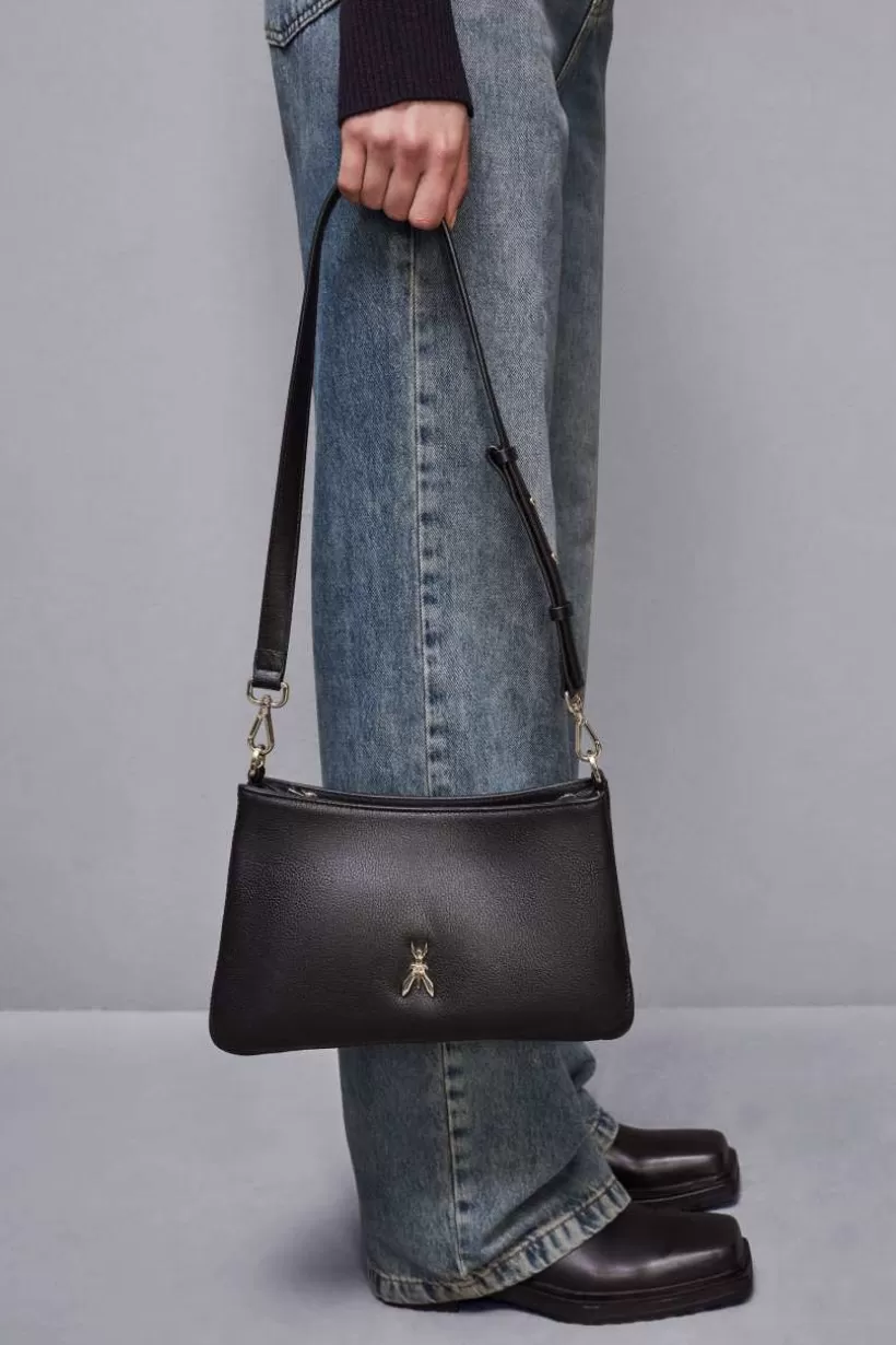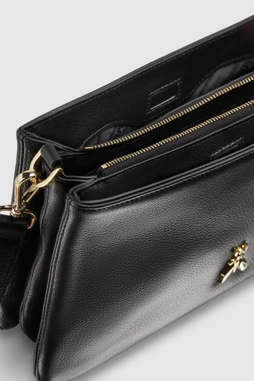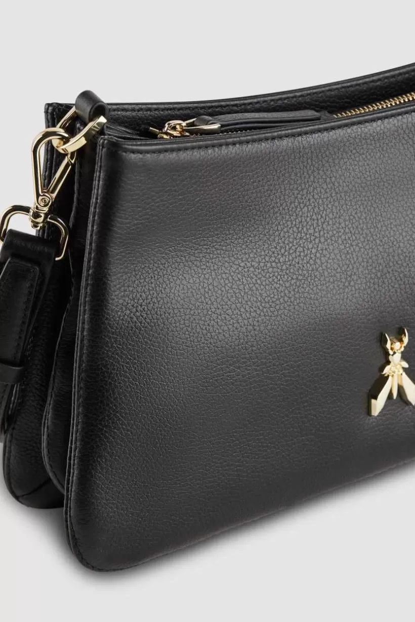 Innowacyjny design i kultowe detale trzykomorowej skórzanej torby Patrizia Pepe z praktycznym odpinanym paskiem na ramię. Symbol Fly pozłacany jasnym złotem i podszewka z maxi logo