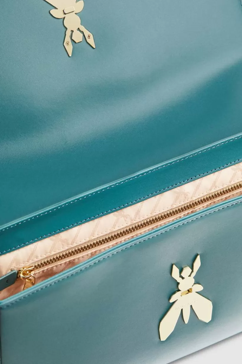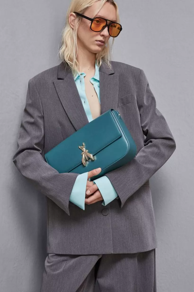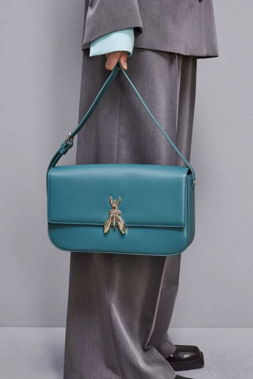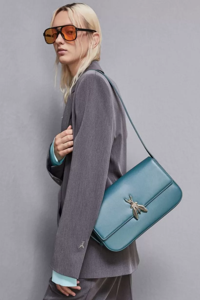 Nowa skórzana torba Patrizia Pepe o minimalistycznych liniach, zapięcie na magnes z Maxi Fly i praktyczny regulowany pasek na ramię z klamrą.