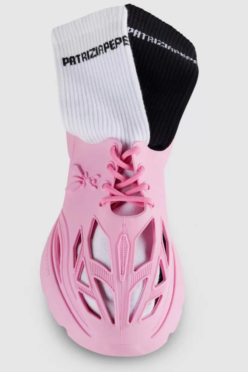 Sneakersy Gummy Pepe są wykonane z gumy z wytłoczonym detalem Fly i spersonalizowaną podeszwą. Wyróżniają się podwójnymi, dopasowanymi sznurówkami, w zestwie również dopasowane skarpetki frotte marki Patrizia Pepe.