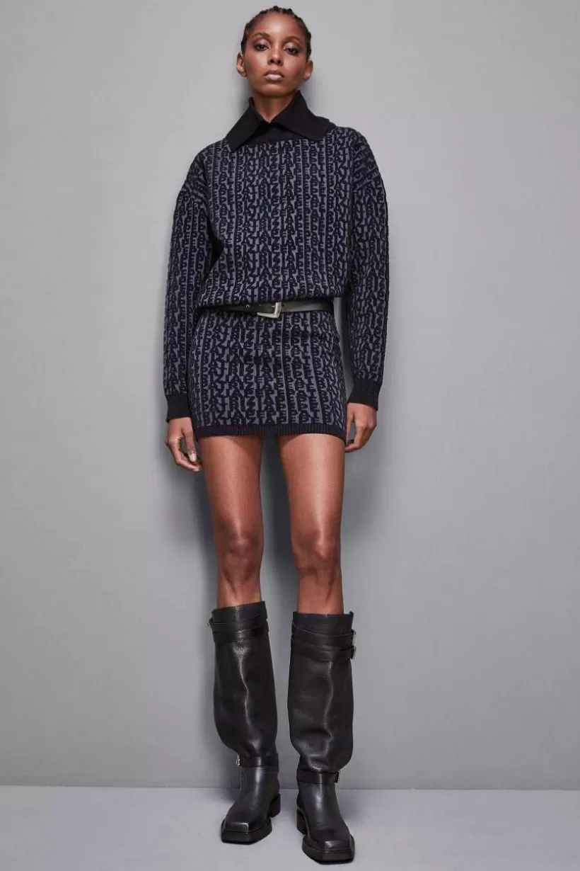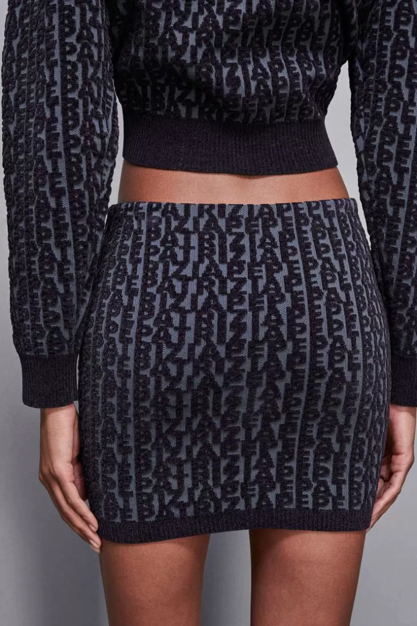 Długość mini i krój slim tej spódnicy podkreślają zmysłowość sylwetki. Wyróżnia się dwukolorowym żakardowym splotem z monogramem i płaskim detalem Fly.