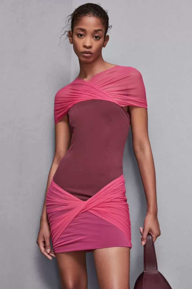 Patrizia Pepe proponuje elegancką dwukolorową mini sukienkę z mieszanki tkanin, ze skrzyżowanym dekoltem i dopasowan…