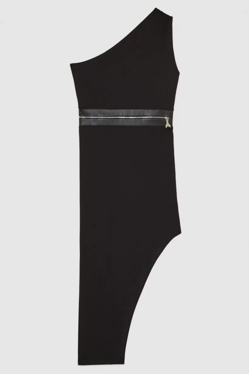 Asymetryczna sukienka na jedno ramię z krepy w jednolitym kolorze to must have każdej odważnej kobiety, która nie boi się zuchwałych stylizacji od Patrizia Pepe. Przywieszka Fly przy metalowym suwaku.