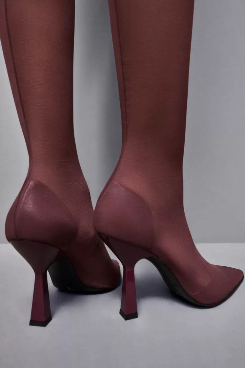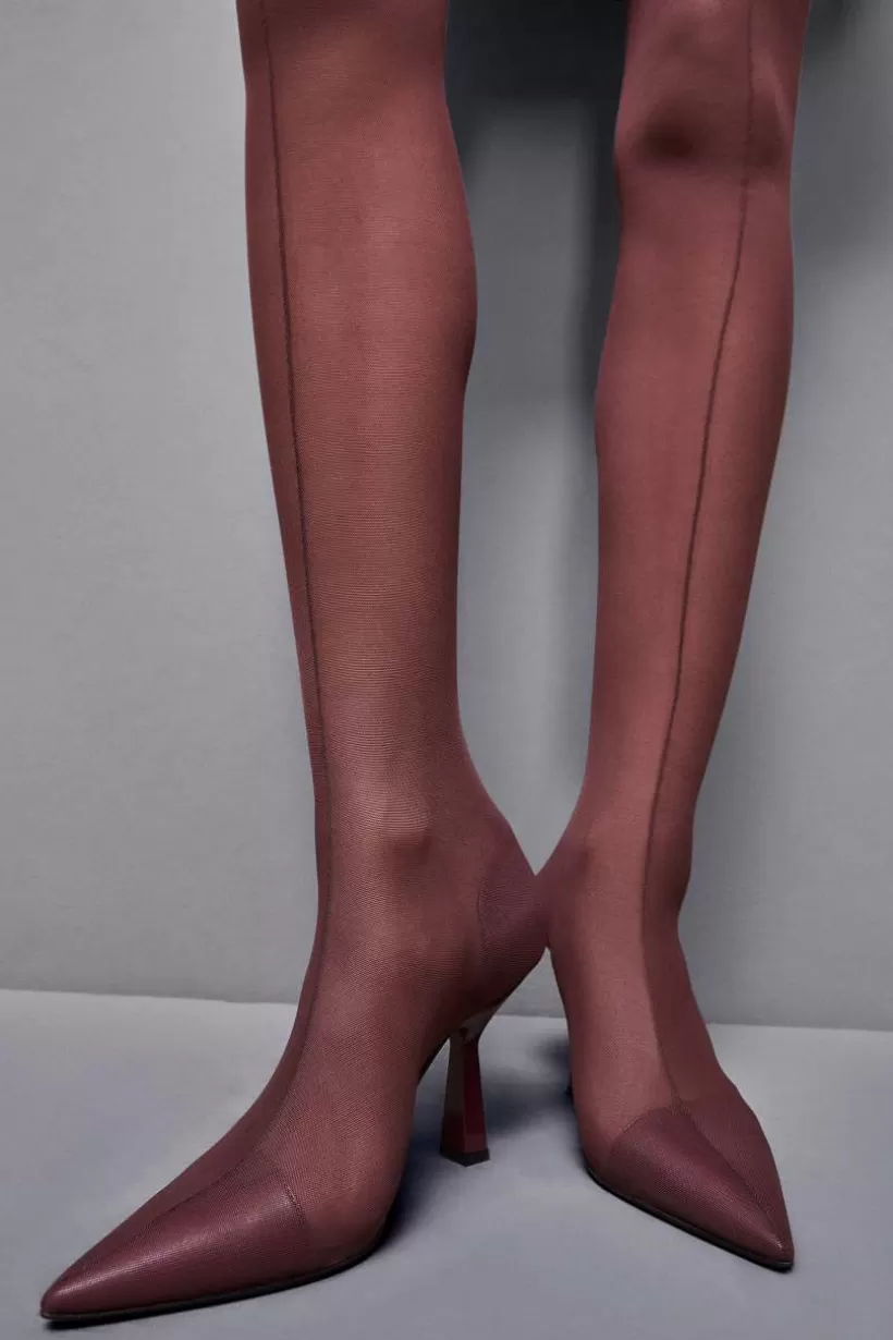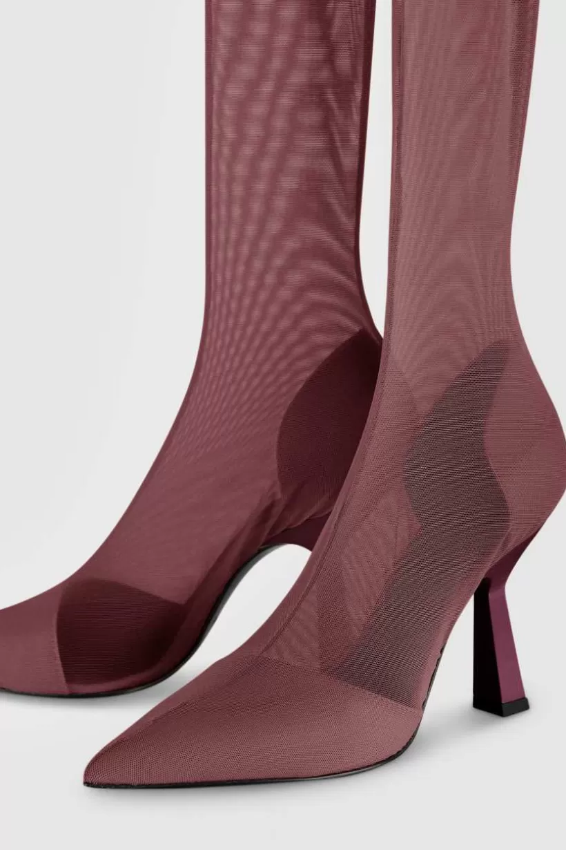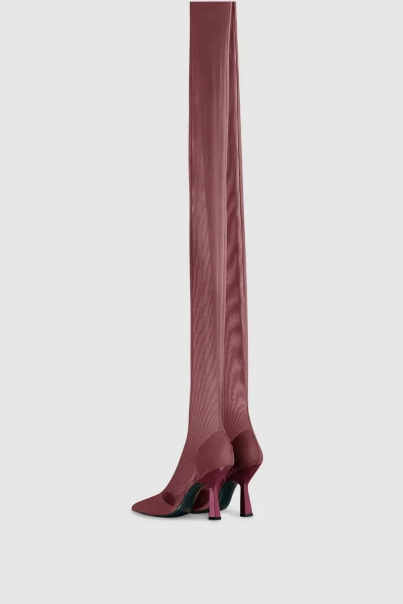 Super wysokie, super glam. Wysokie kozaki cuissard z cholewką wykonaną z tiulu z dodatkiem streczu tworzą uwodzicielski efekt przezroczystości. Rzeźbiony 10-centrymetrowy obcas dodaje impetu sylwetce.