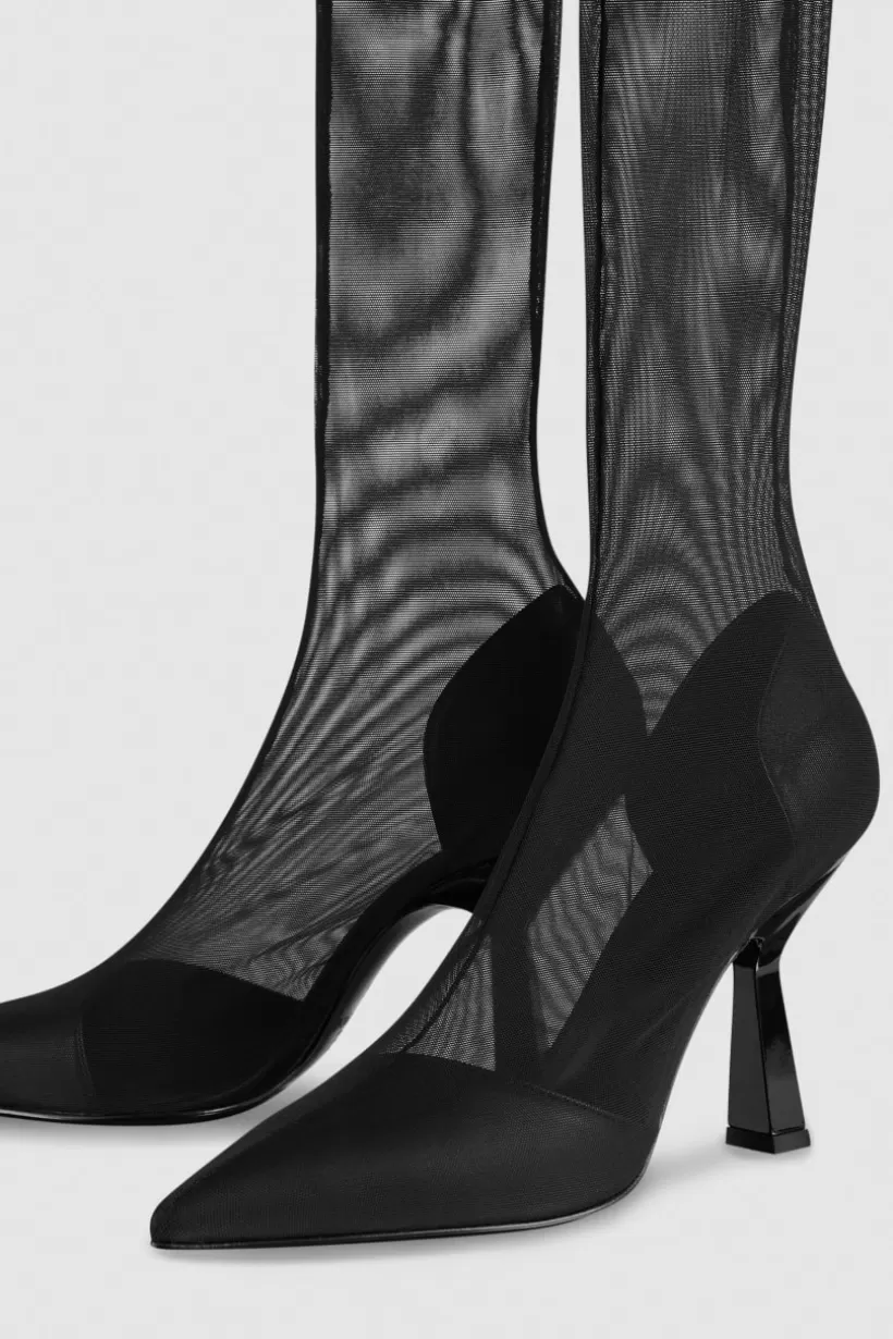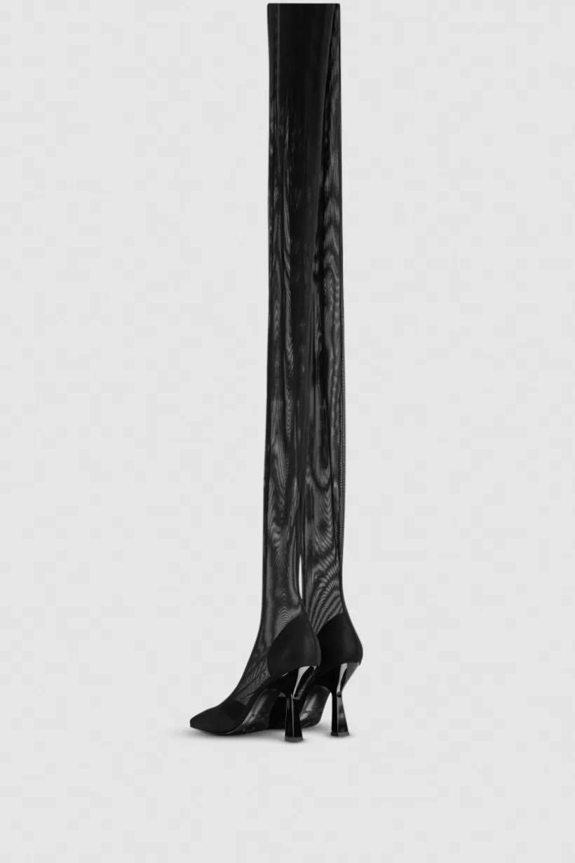 Super wysokie, super glam. Wysokie kozaki cuissard z cholewką wykonaną z tiulu z dodatkiem streczu tworzą uwodzicielski efekt przezroczystości. Rzeźbiony 10-centrymetrowy obcas dodaje impetu sylwetce.