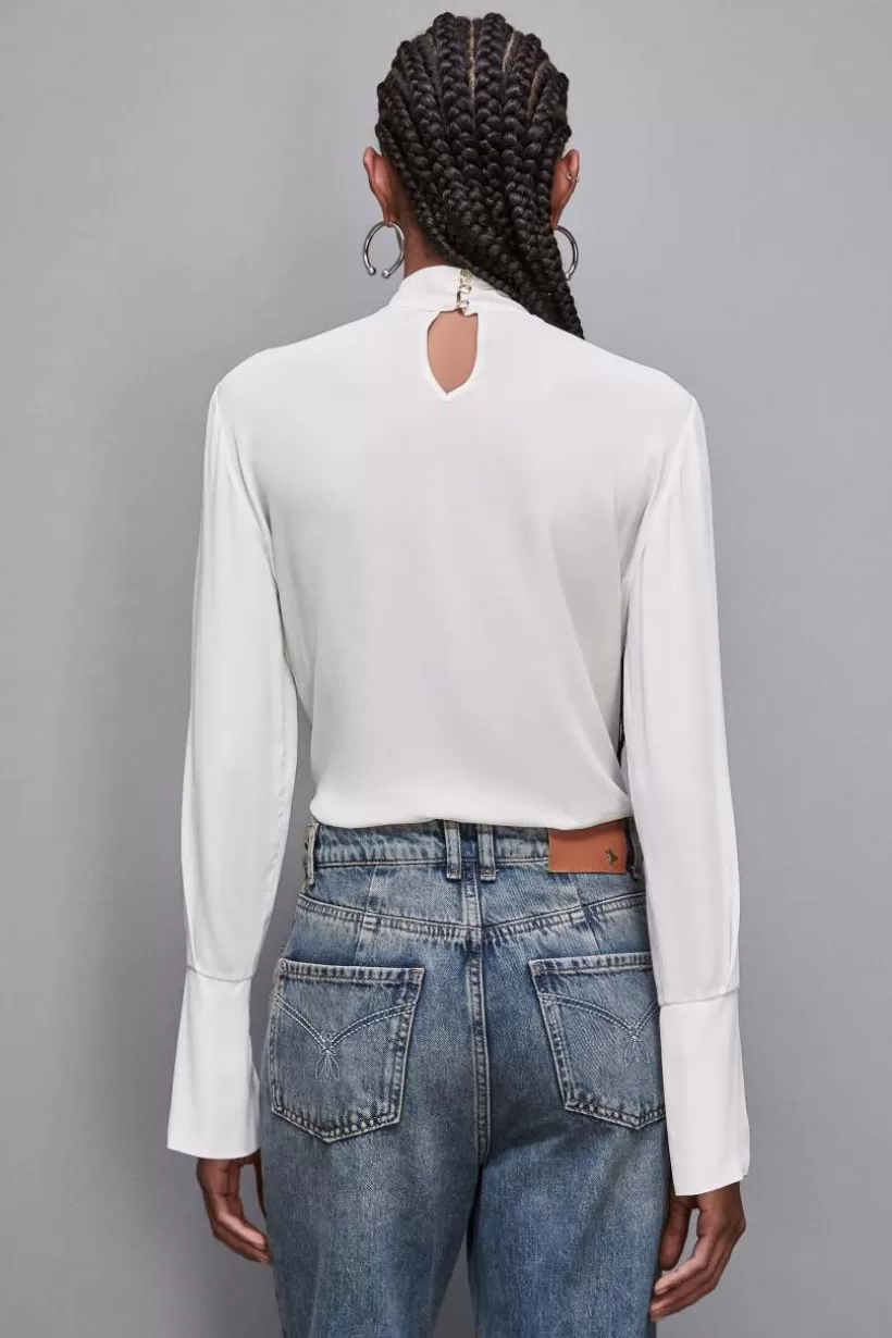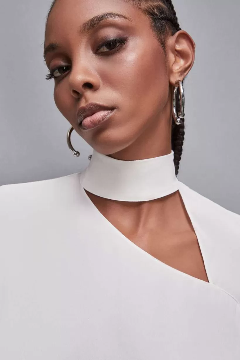 Tunika z wiskozowej krepy z efektownymi detalami, które dodają kobiecości i wyrafinowania: półgolf z asymetrycznym wycięciem i mankiety maxi.