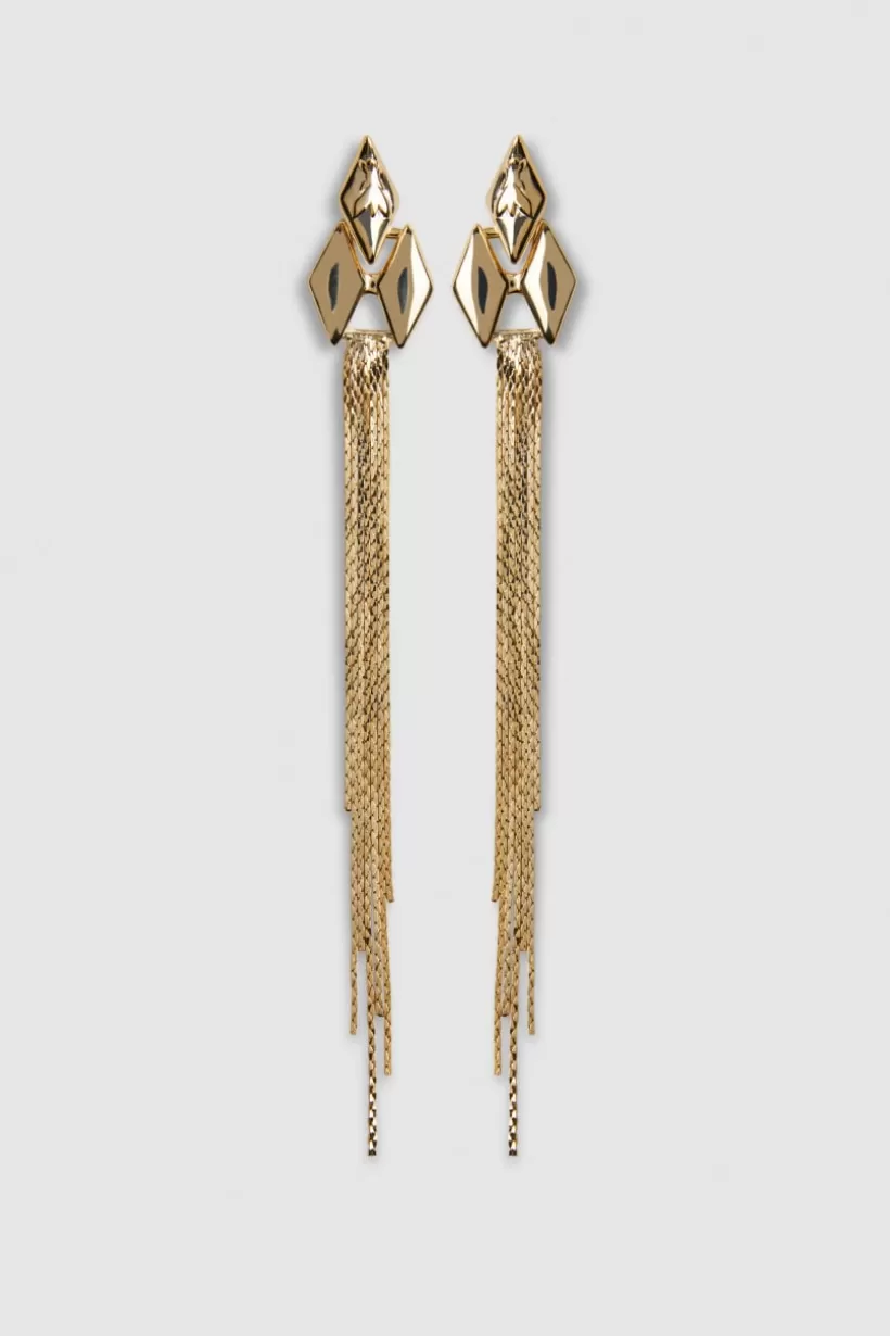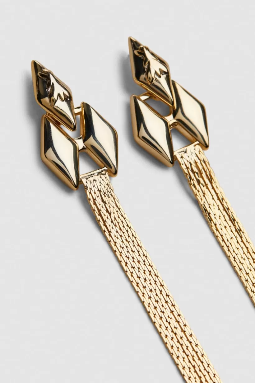 Mosiężne kolczyki staną się najmodniejszym elementem Twojej wieczorowej stylizacji. To, co wyróżnia te eleganckie i zmysłowe kolczyki to micro ogniwa Fly i lśniące frędzle.